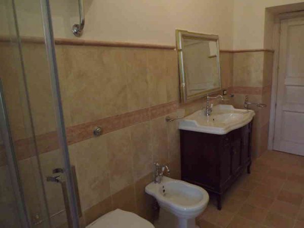 bagno con pavimento in travertino paglierino rivestito in travertino paglierino e bianco con greche in rosa tea