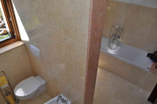 bagno con pavimento e rivestimento in silvia oro lucido soglie in rosa tea