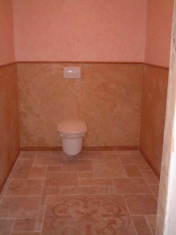 bagno con pavimento e rivestimento in travertino anticato rosone intarsiato in travertino noce