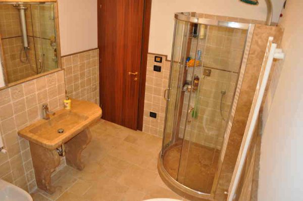 bagno con pavimento in travertino paglierino anticato pareti travertino burattato filo sega con matonelle 15×15 lavandino e piatto doccia in travertino noce chiaro
